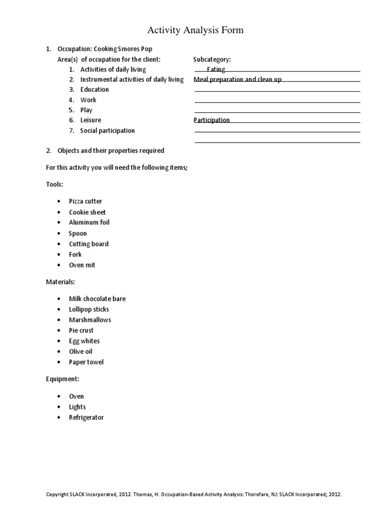 Search Q Activity Analysis Form Tbm Isch from Analysis, activity analysis application to occupation gayle ilene. An activity analysis is a systematic evaluation of an activity to determine its suitability for a particular client or intervention. You should read the directions before doing an activity. Activity analysis occupational therapy sample. Activity analysis is one of the oldest occupational therapy processes. This activity will help me treat patients in my future occupational therapy assistant career. By categorizing these tasks, you will be able to work on these skills in a variety of contexts. • physical • cognitive • psychological • interpersonal.